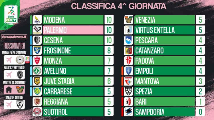Serie B, 4ª giornata: continuano a vincere Palermo, Modena e Cesena, si fermano Empoli e Venezia